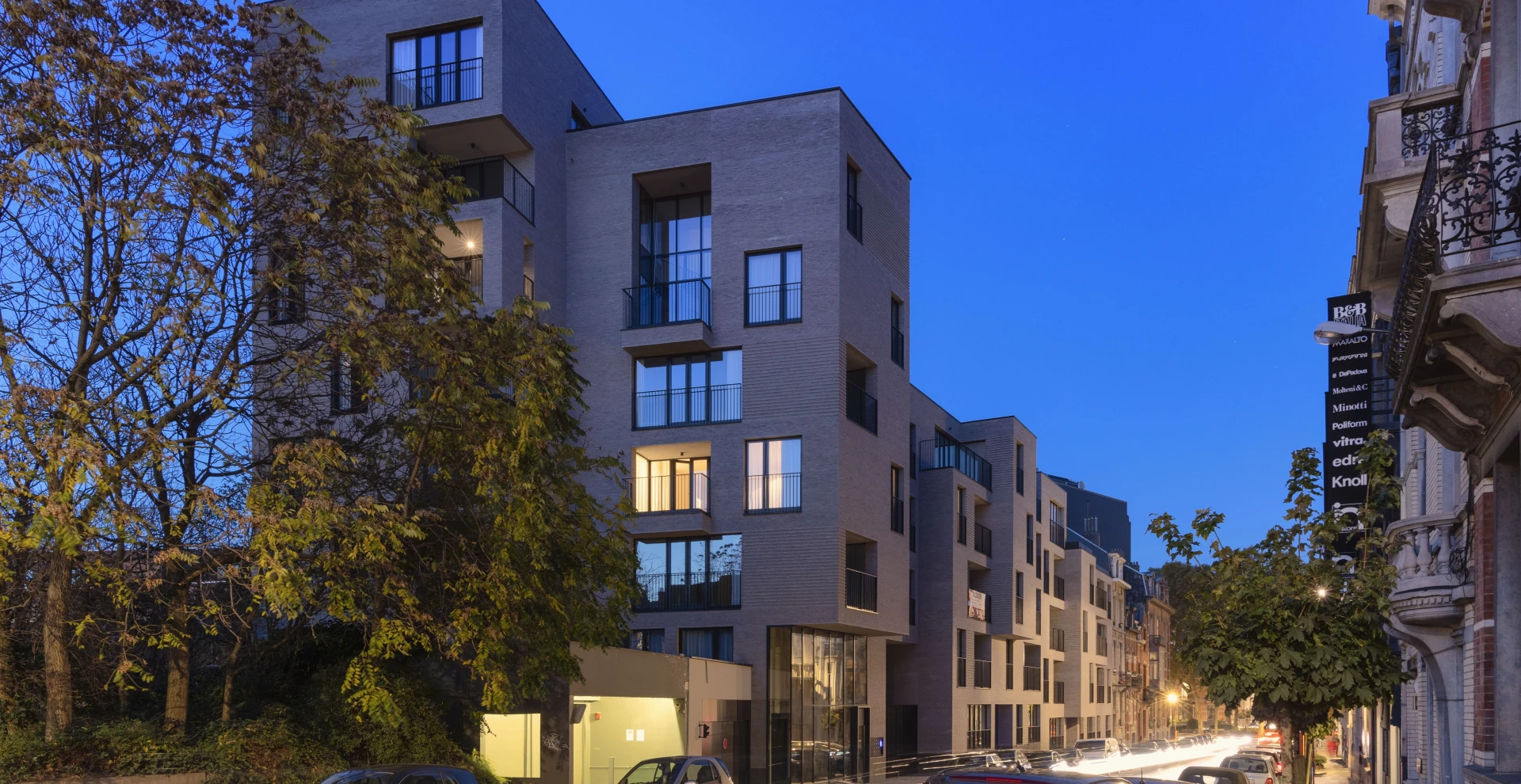The building, with its grey bricks, blends perfectly into the outlines of the existing Brussels houses. Its volume creates an intelligent transition between the outline of the houses and the considerable volume of the neighbouring apartment building, the Beaugency. The facade on the street side aligns with the height of the adjacent terraced house, rises progressively and eventually reaches seven storeys in its highest part.